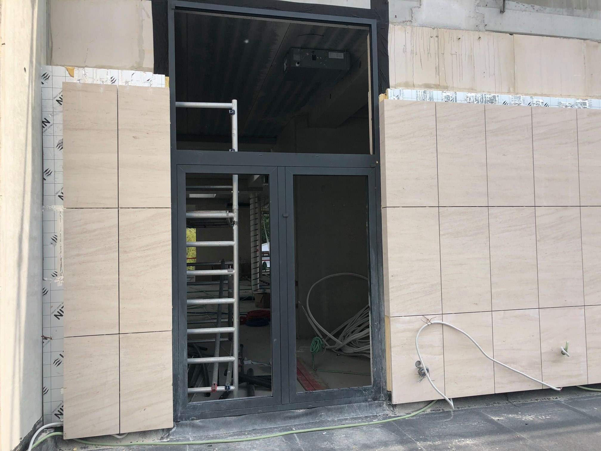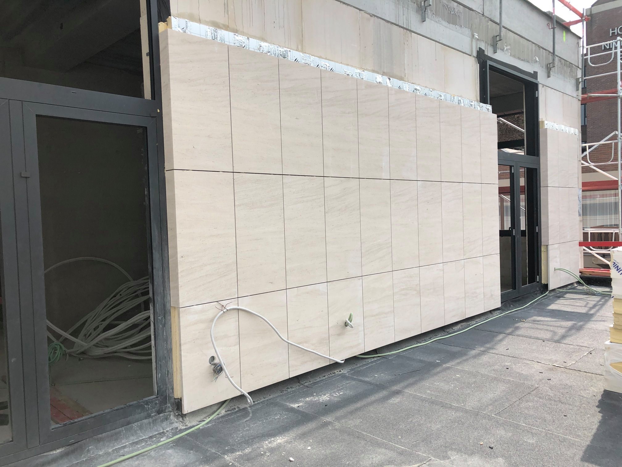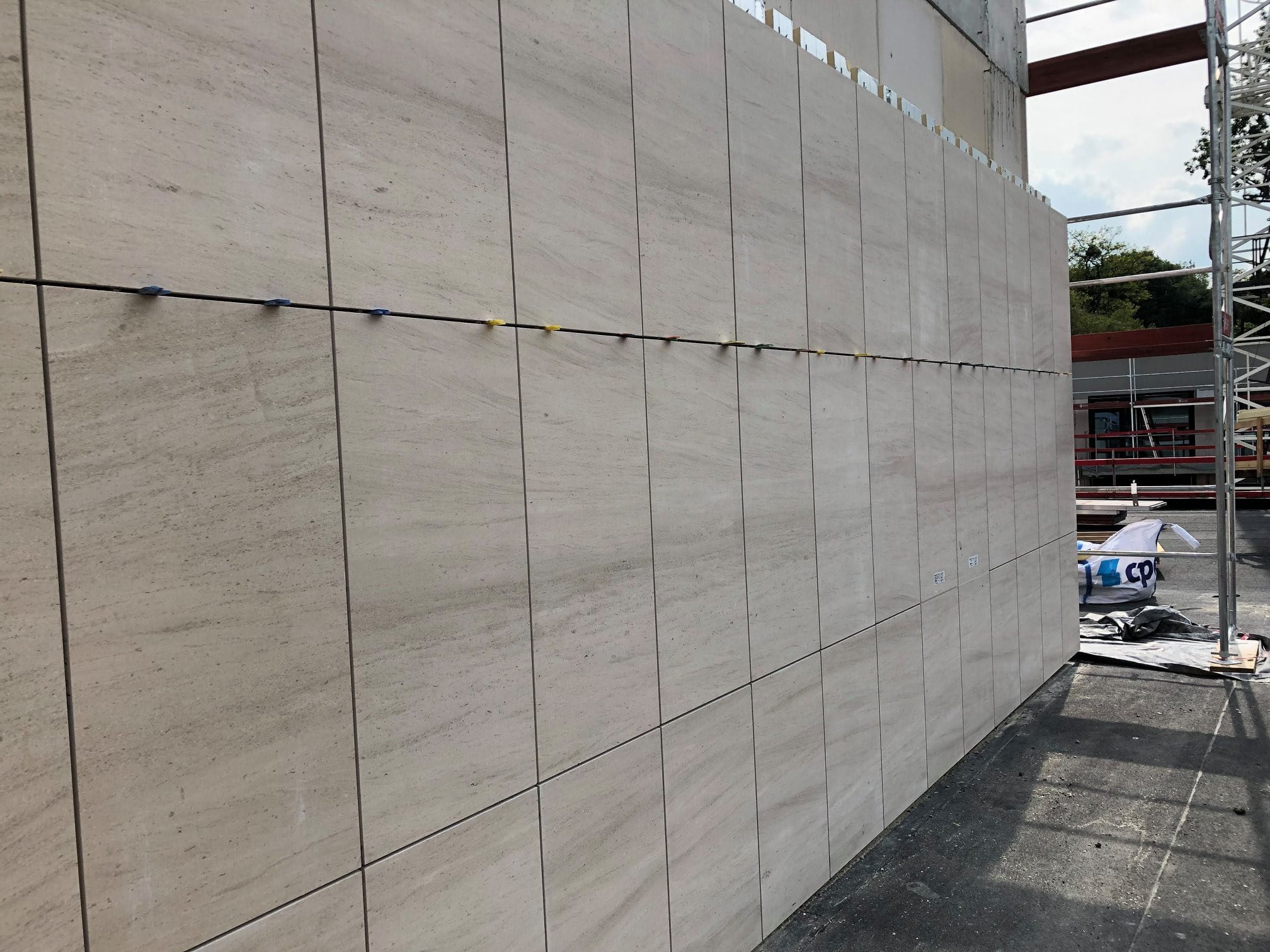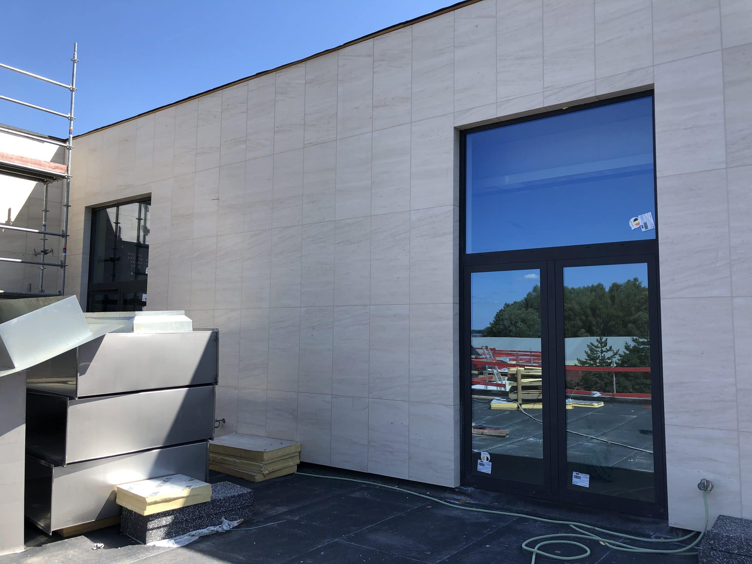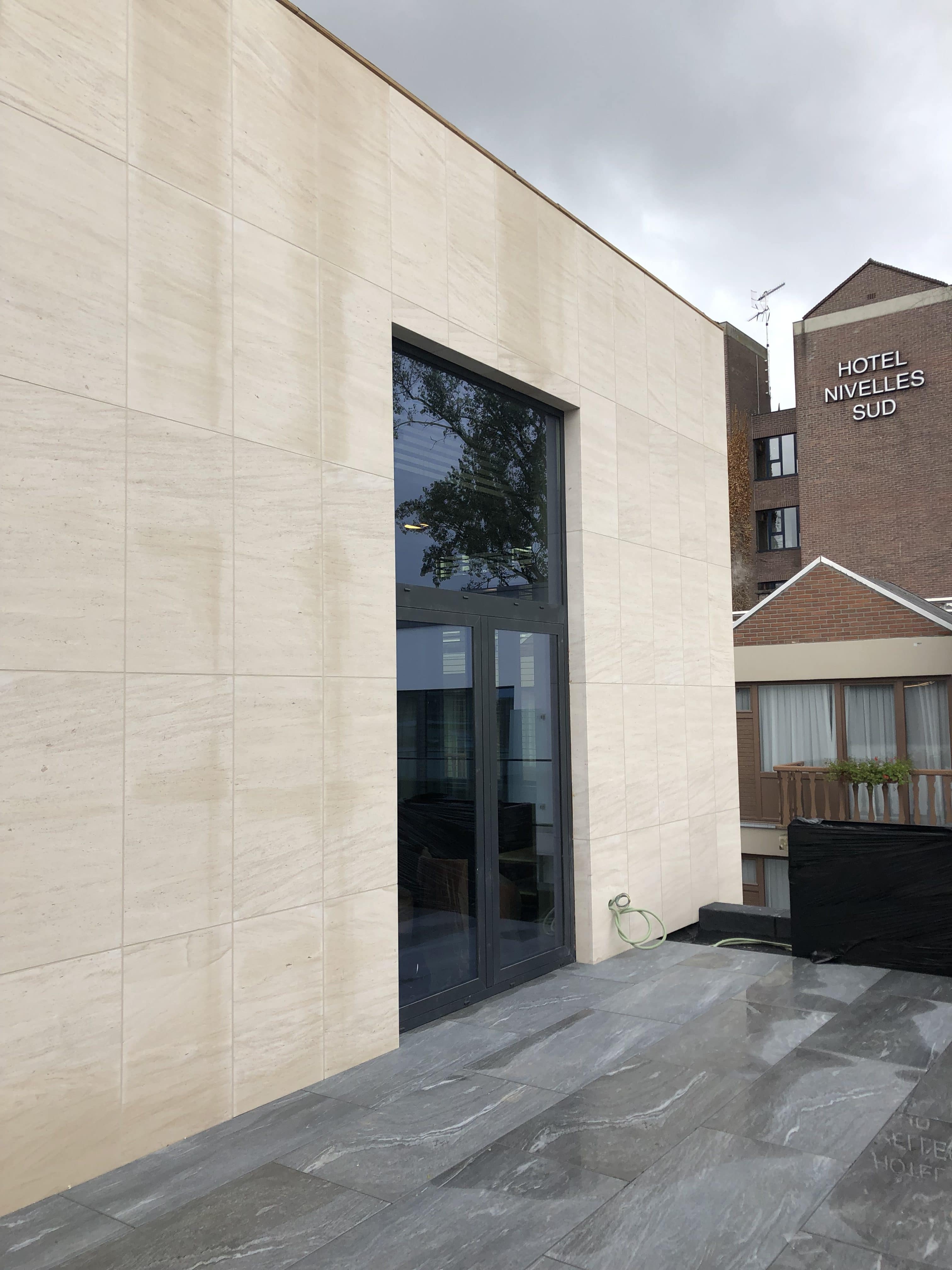Façades en pierre calcaire type Moca crème à grains moyens à contrepasse d’ép. 3cm en finition adoucie.