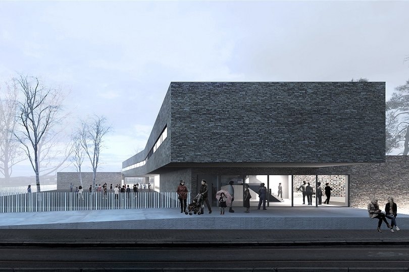 Soubassements en pierre bleue belge, finition ciselée mécanique verticale d’ép. 5cm, angles en bec d’oiseau avec arrêtes brisées.