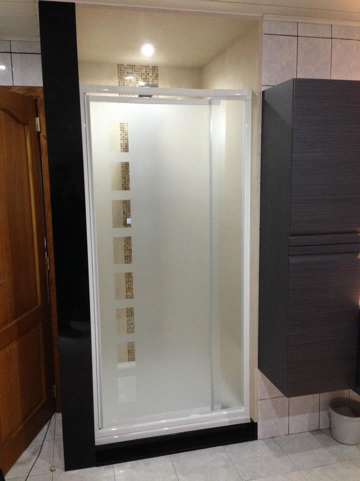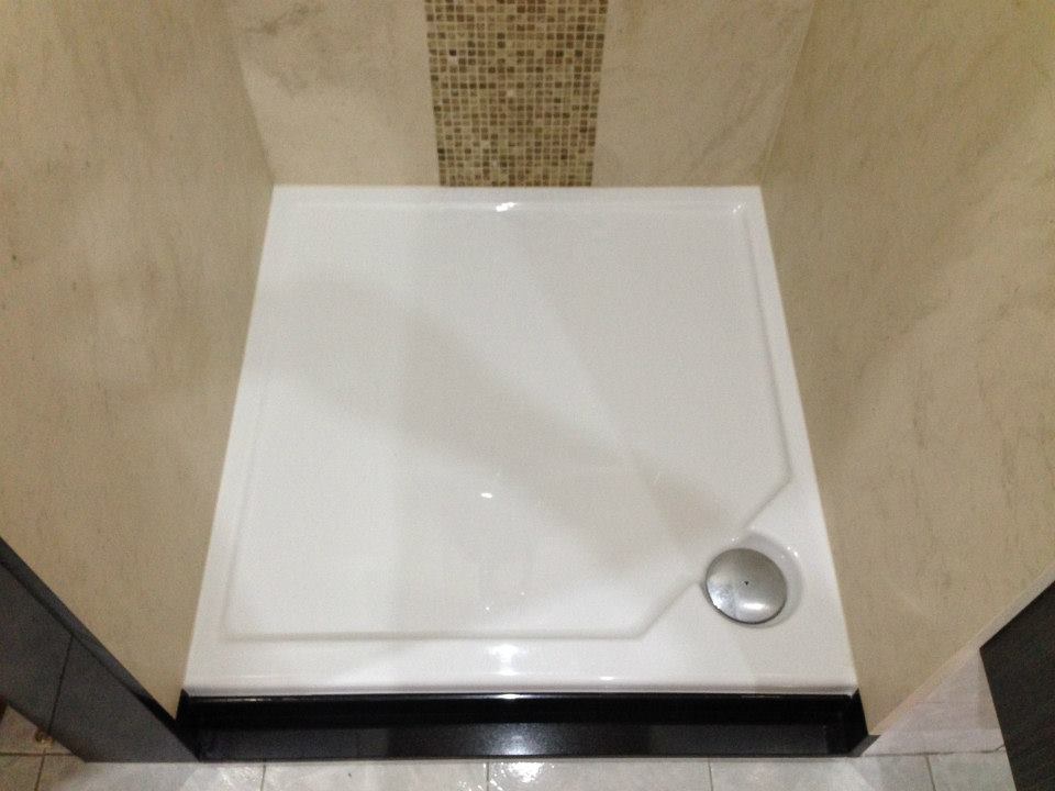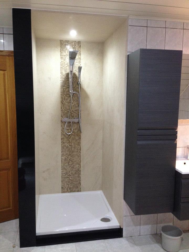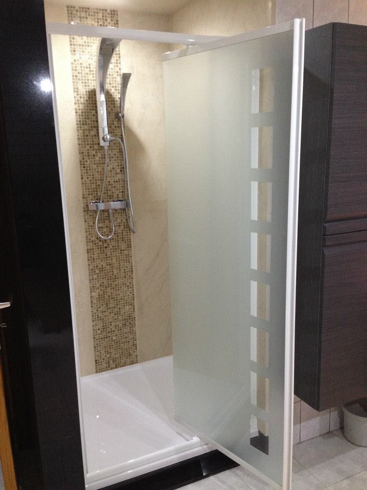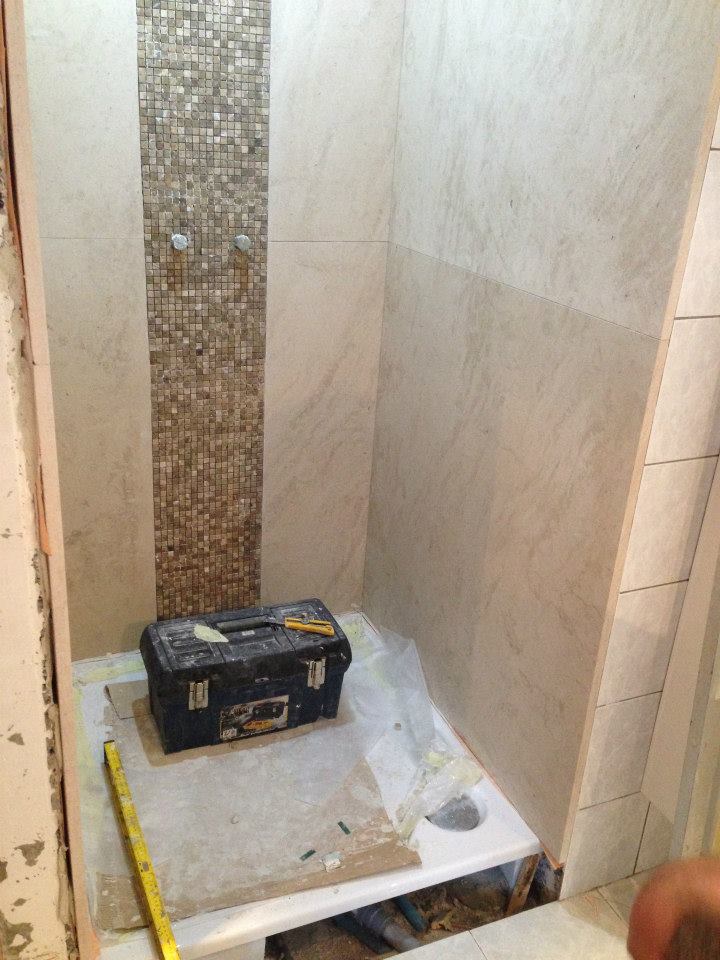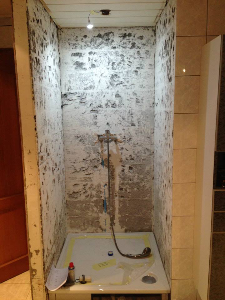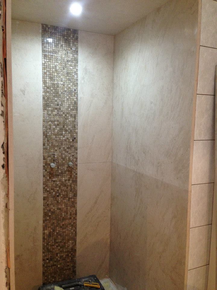 Salle de bain 1 Les murs et plafond en pierre calcaire « Saint Moulin » . Au centre, une mosaïque italienne » Emperador Light » . Le contour extérieur est en granit noir « Indian Black »