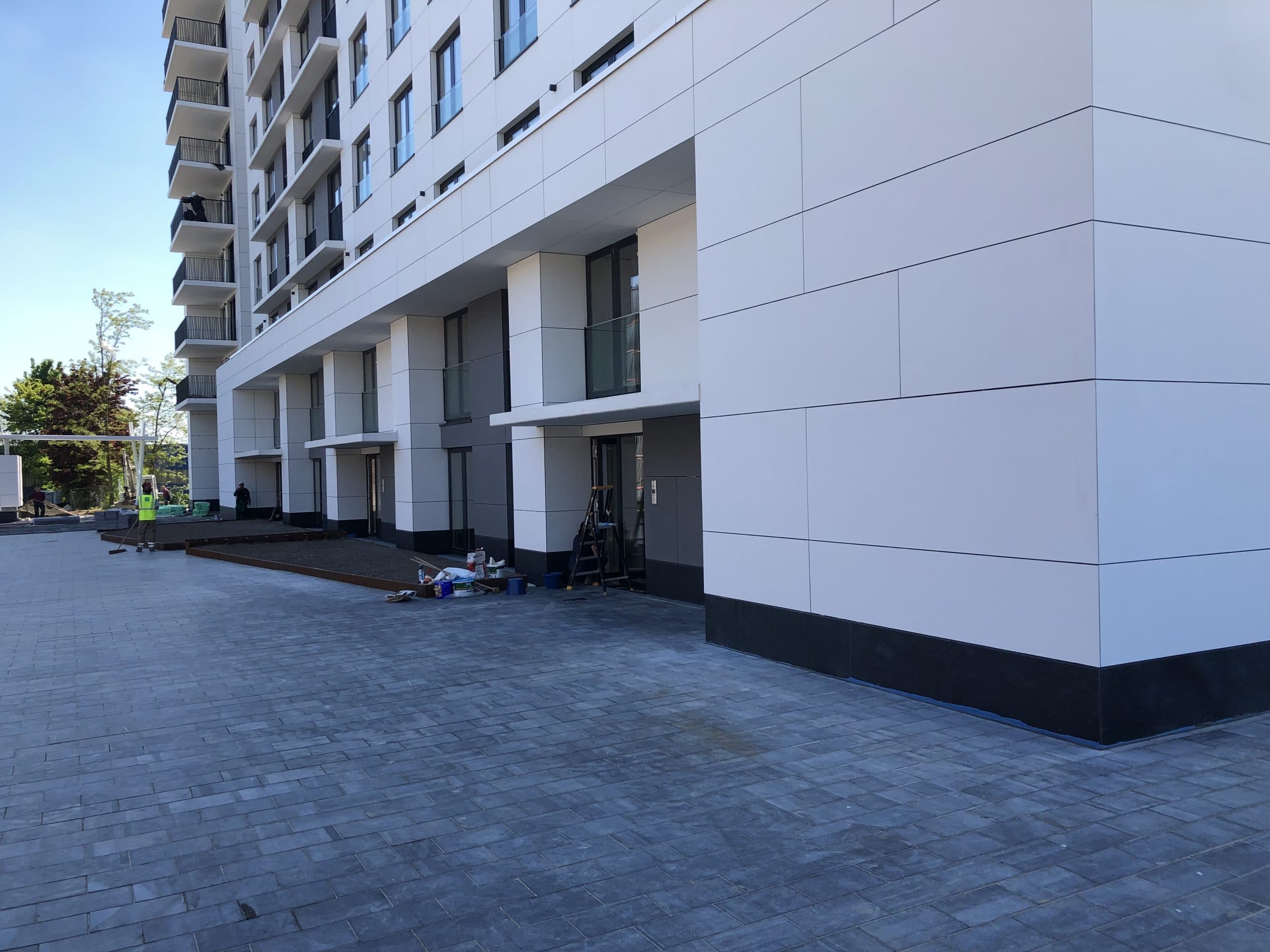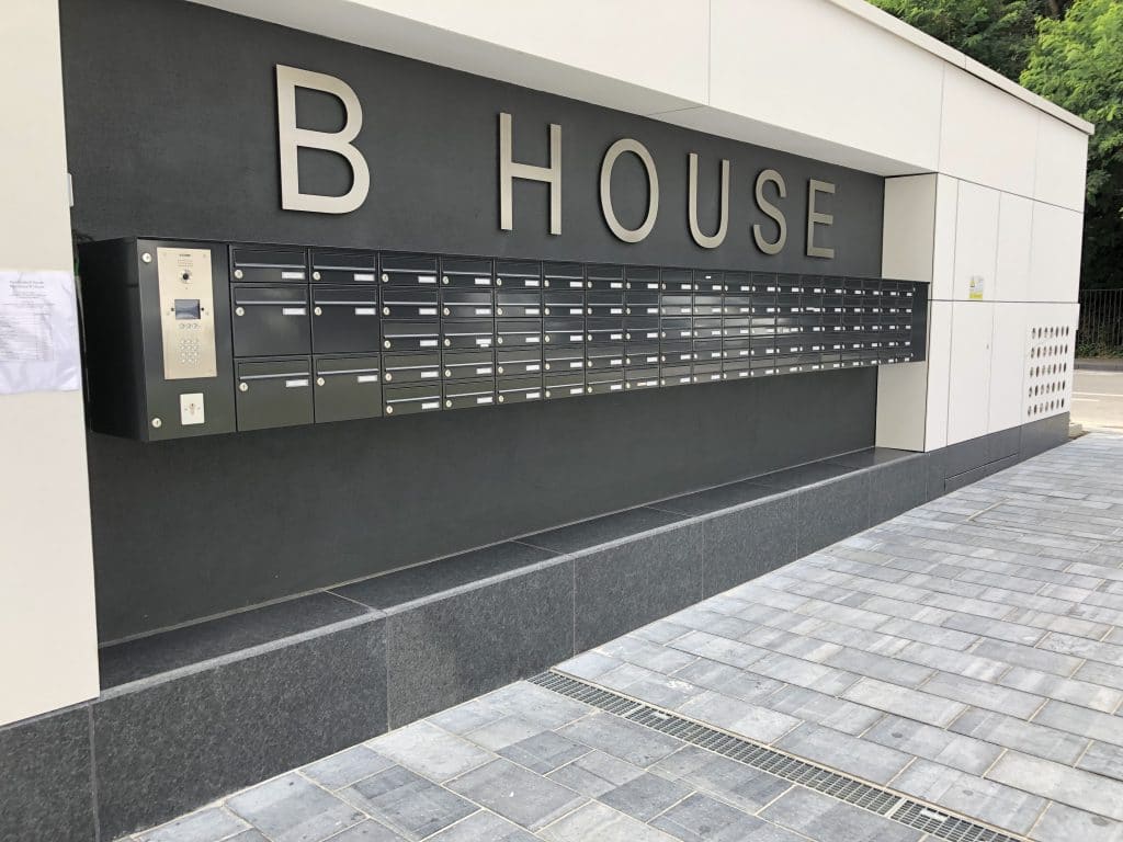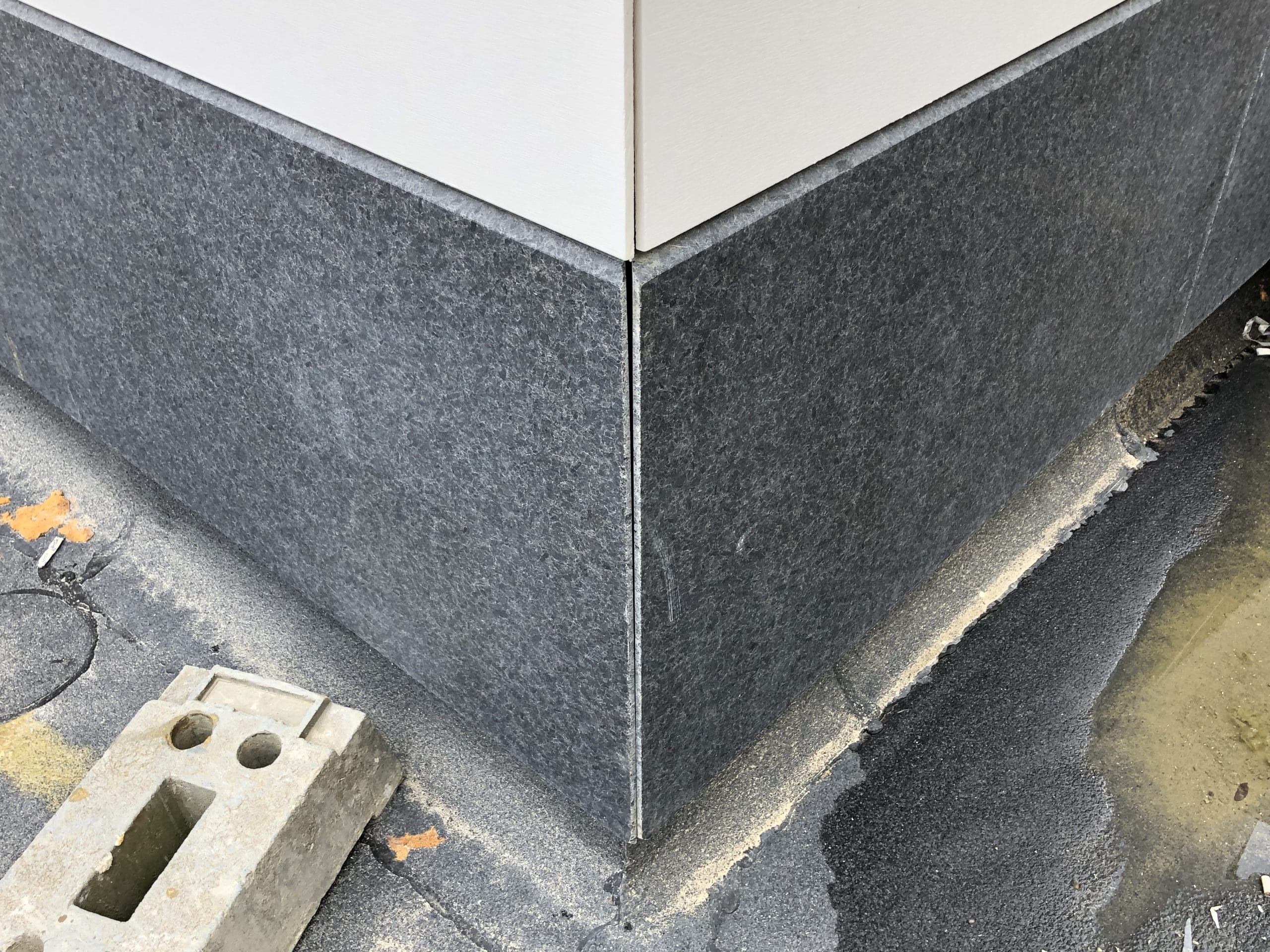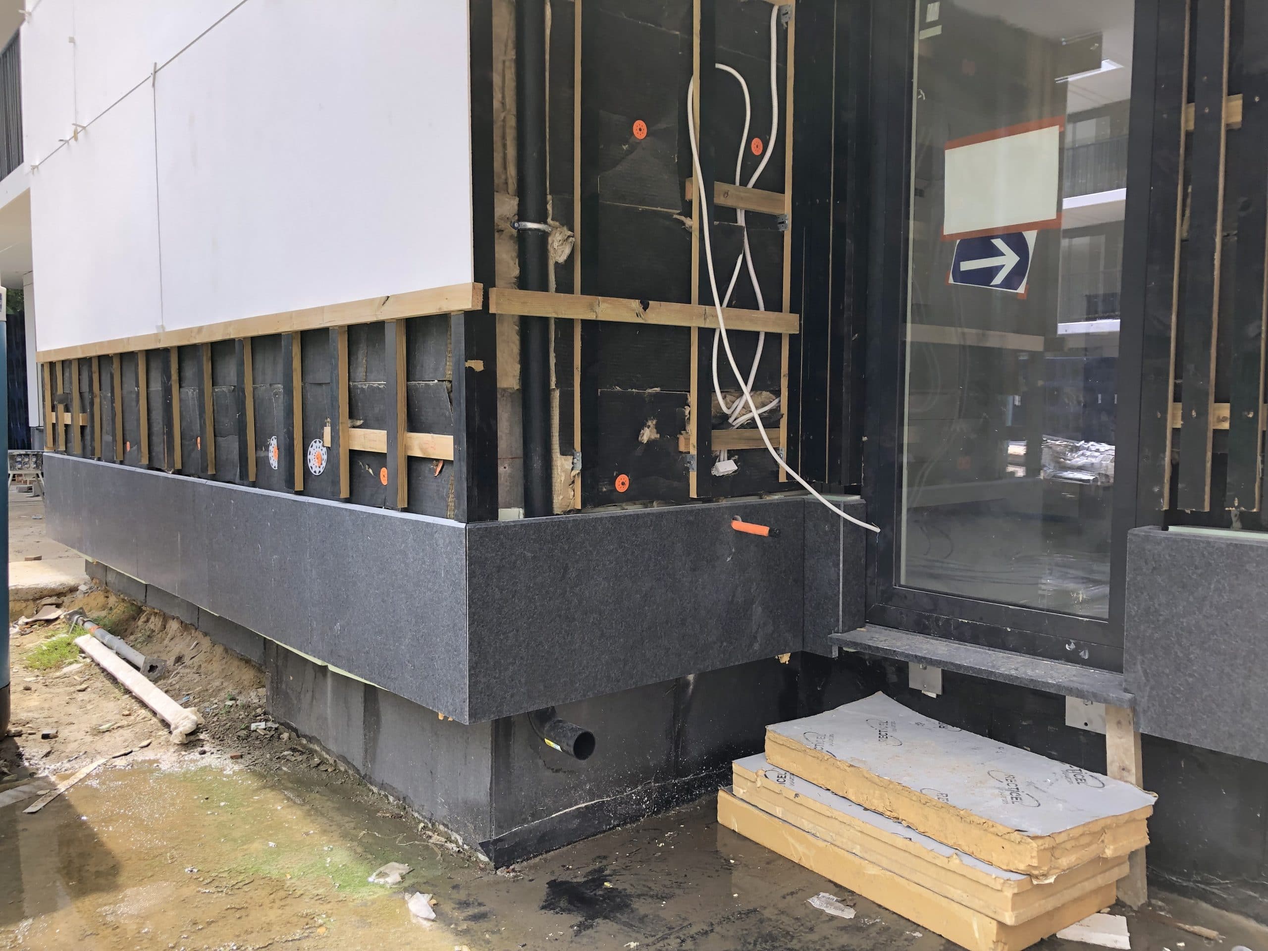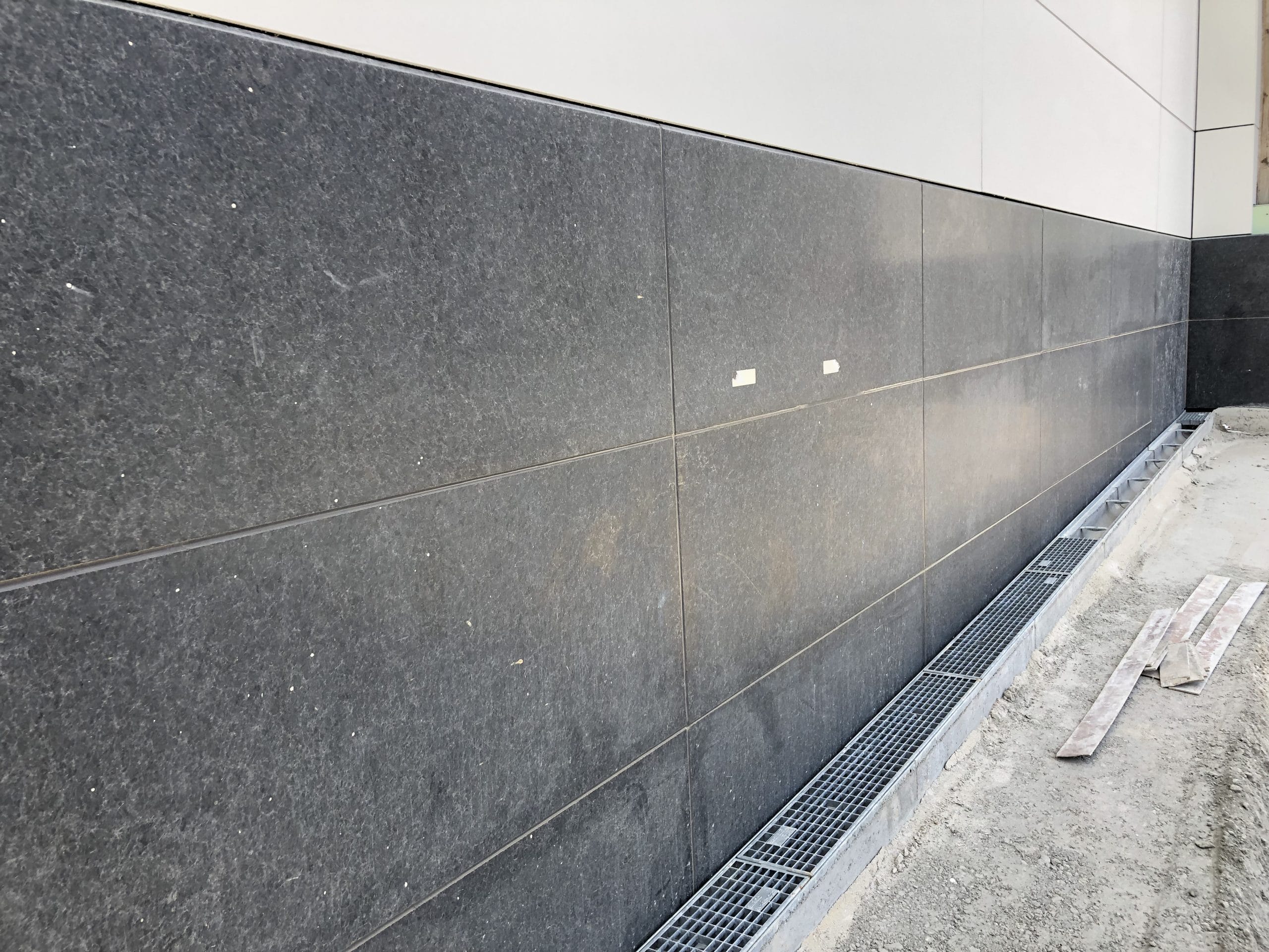 Soubassement en façades en granit Nero Angola d’ép. 4cm finition flammée. Seuils et couvre-murs en granit chinois Pepperino Dark ou G654 d’ép. 4cm finition flammée et adoucie.